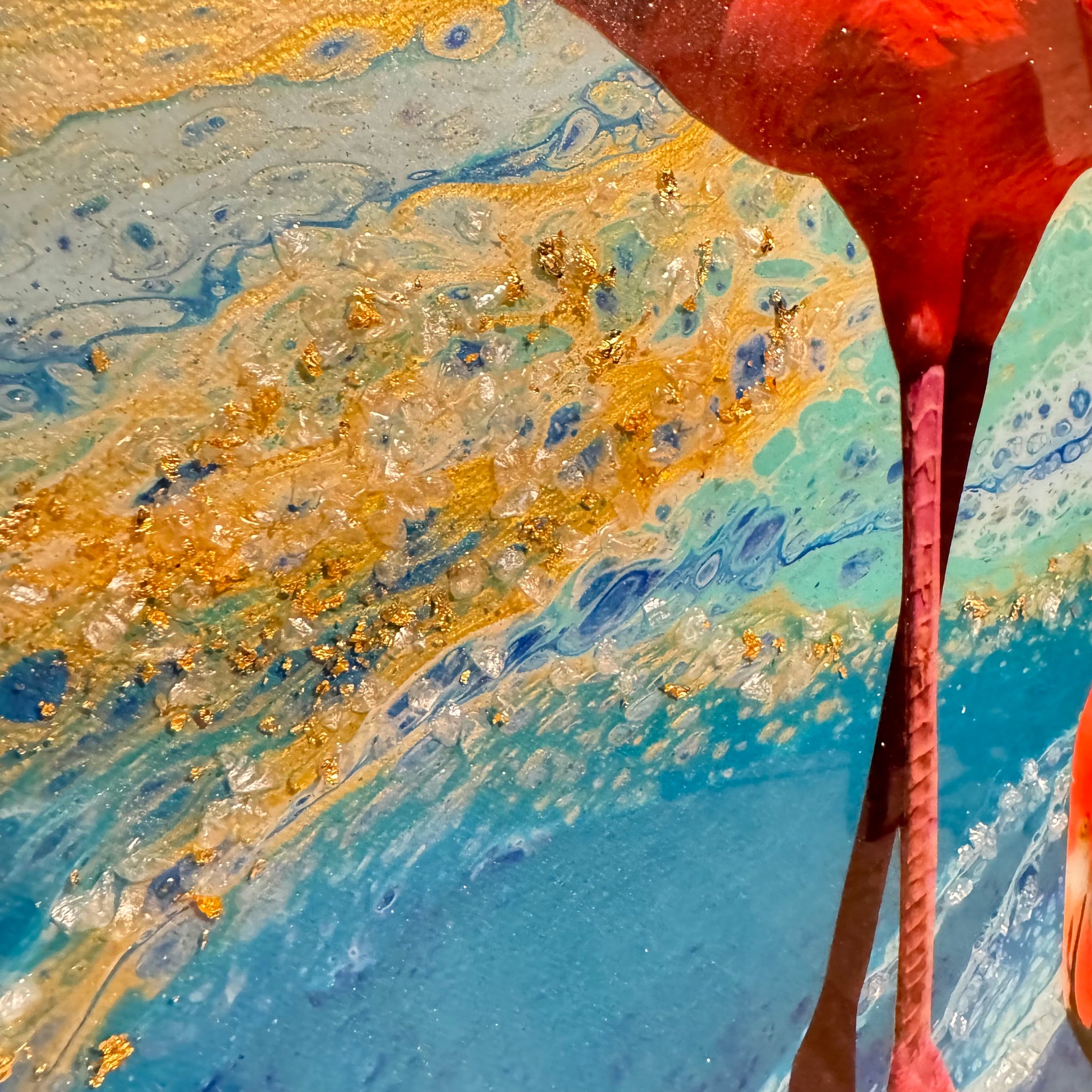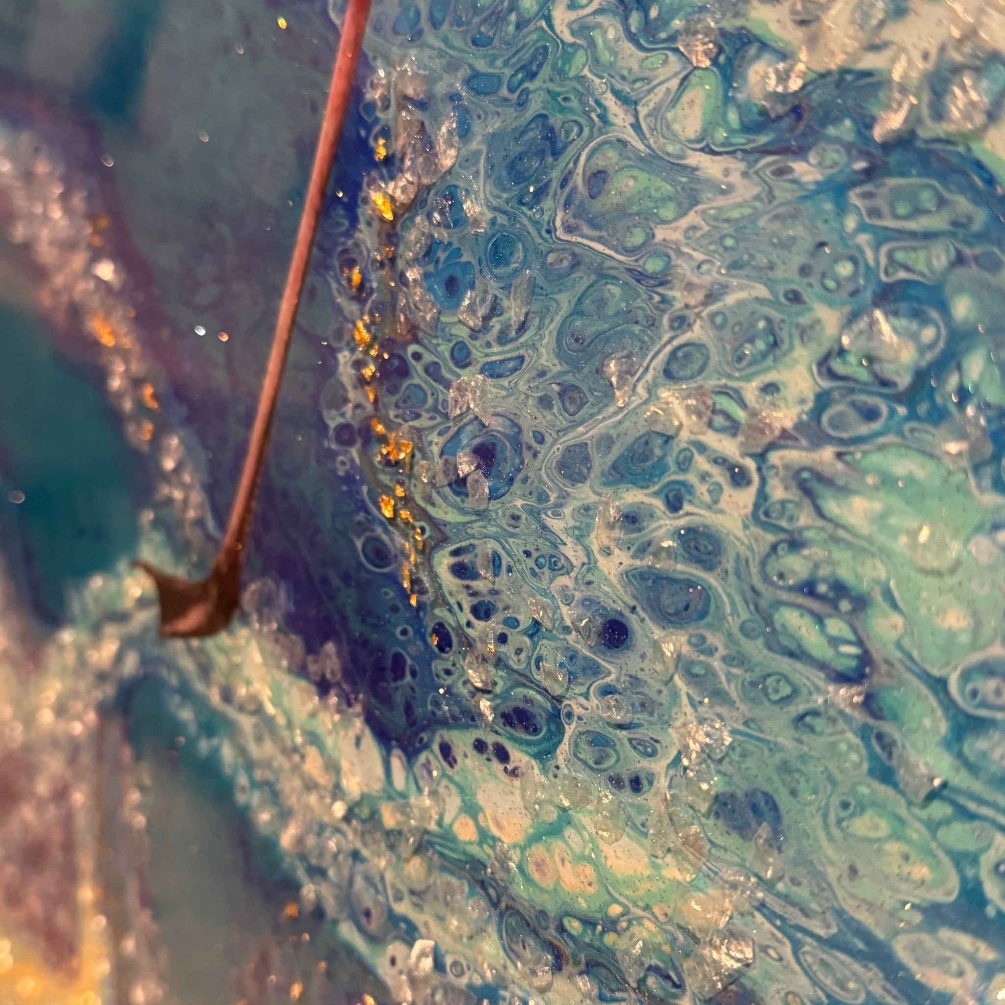 Acrylic on 36x36 gallery wrapped canvas. Embellished with gold leaf, crushed glass, alcohol ink, and resin.