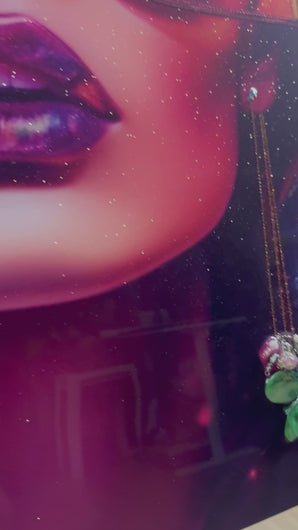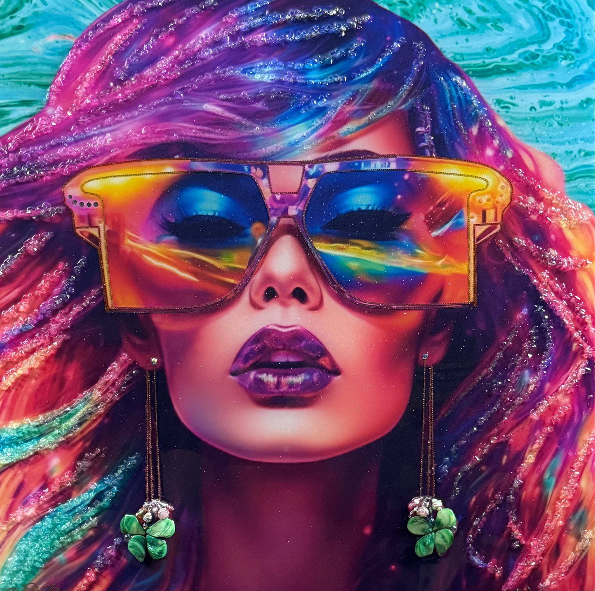 30x30 Mixed media on canvas embellished with shells, rhinestones, gemstones, diamond dust, crushed glass, and resin.